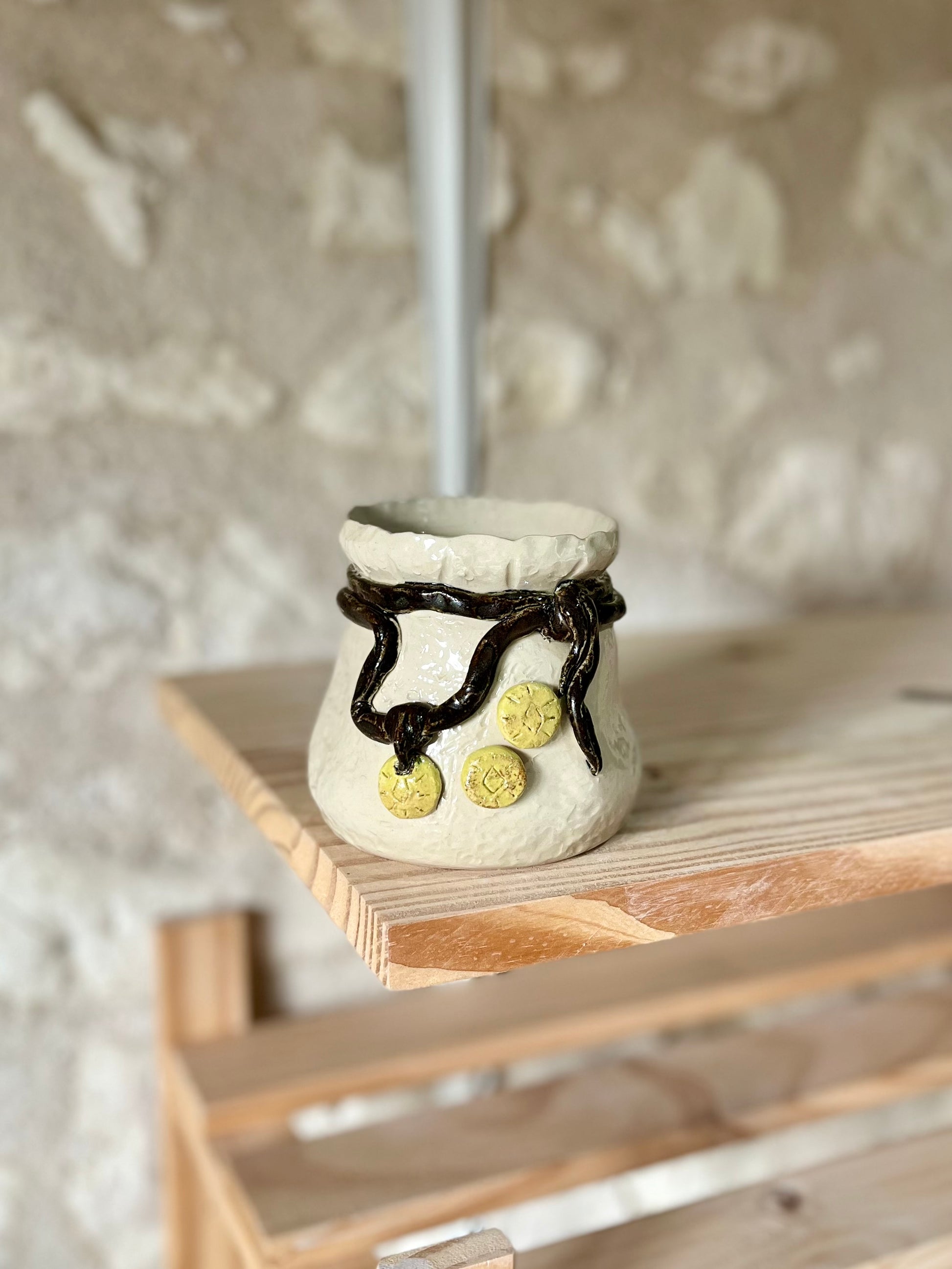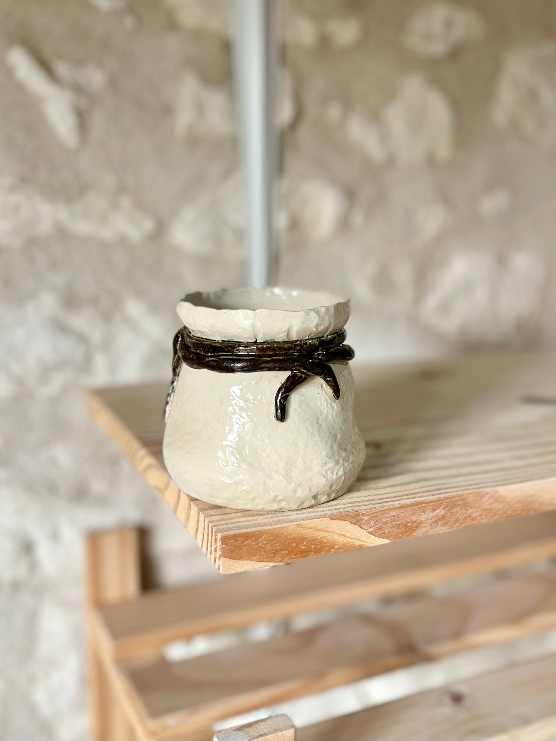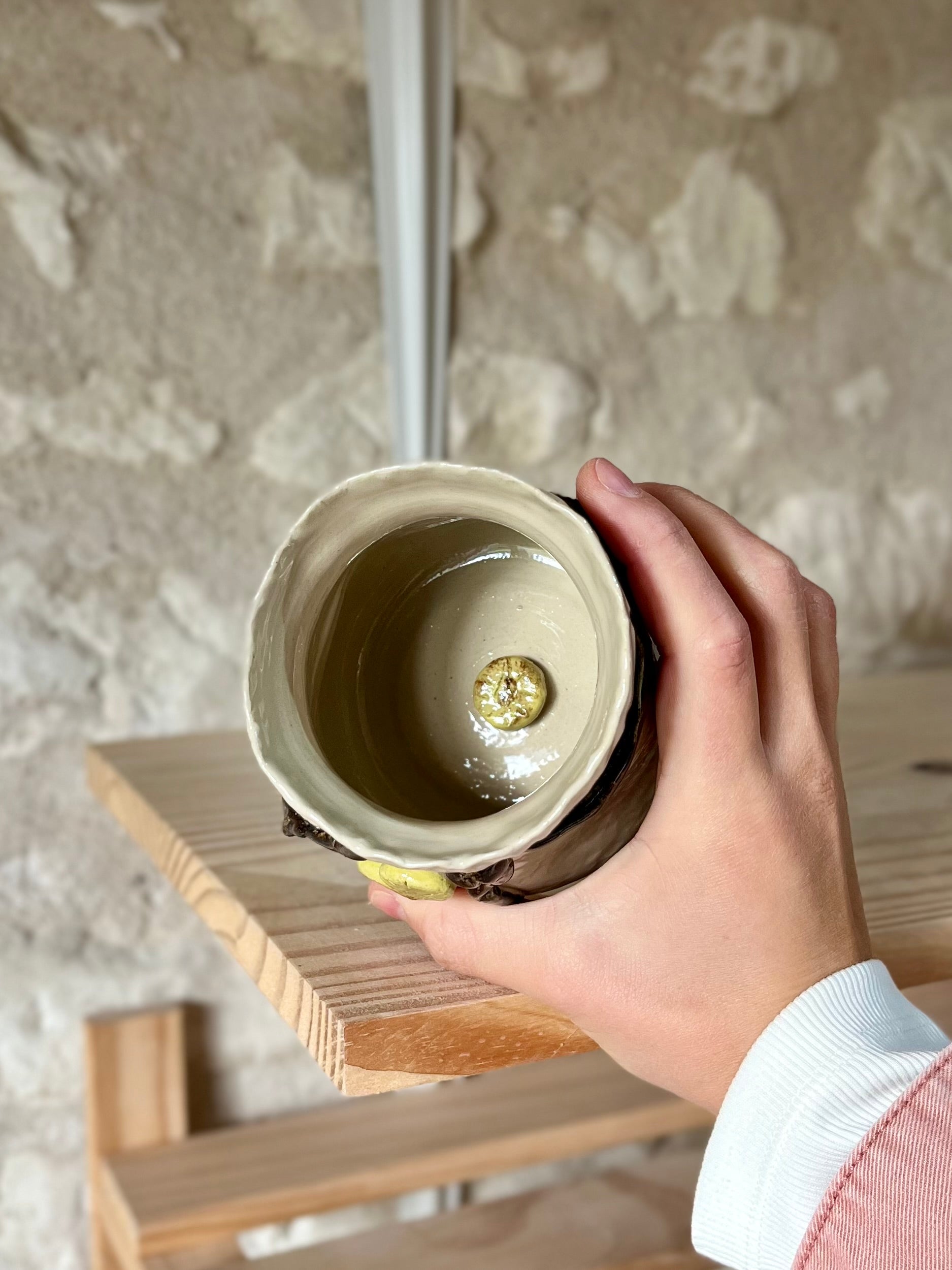 Pièce Claytober 2025 réalisé au tour de potier puis modelé, engobé et émaillé à la main.