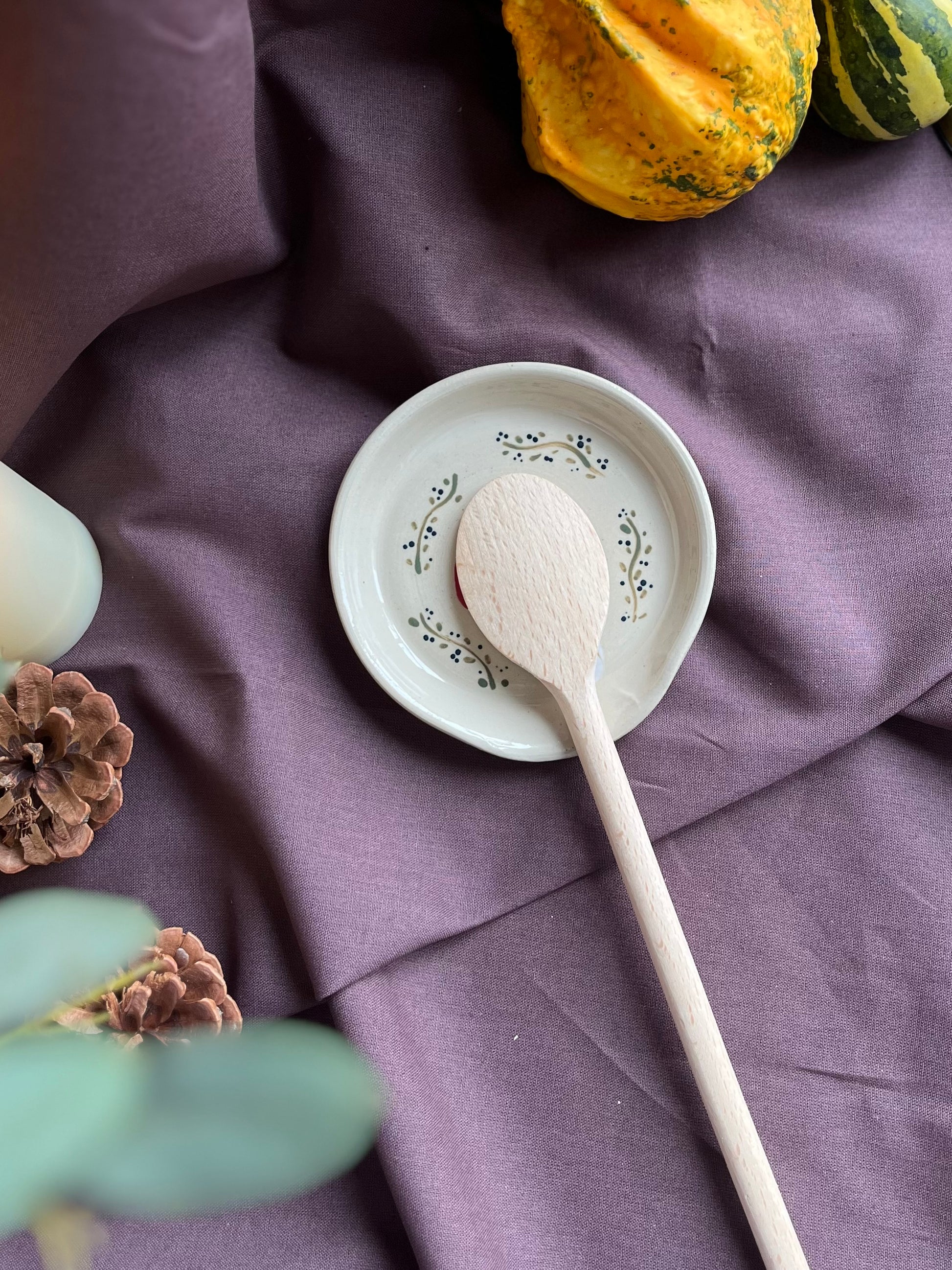 Repose cuillère en grès blanc tournée et décorée à la main. Idéale pour présenter accompagner la préparation de vos repas ou comme pièce décorative.