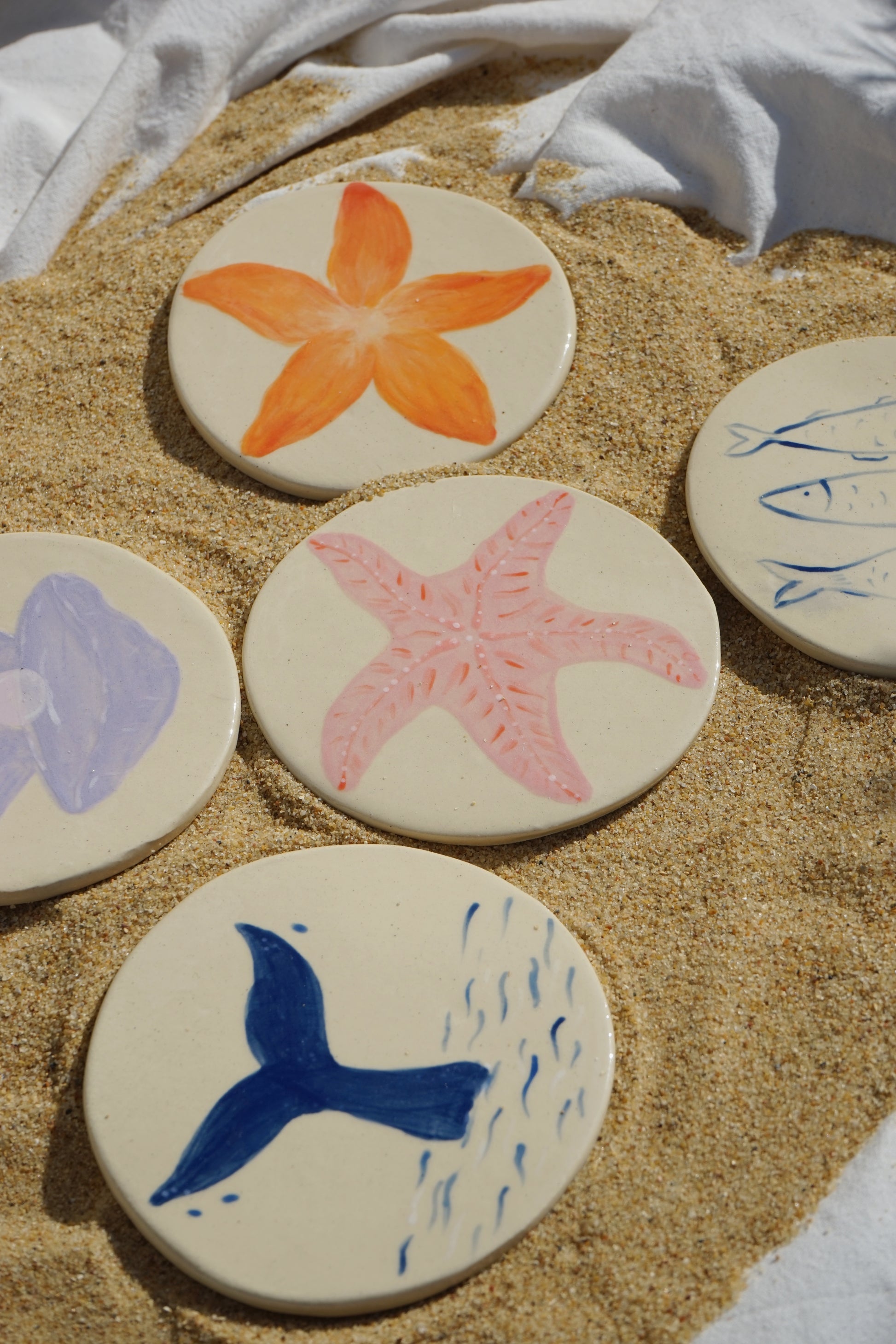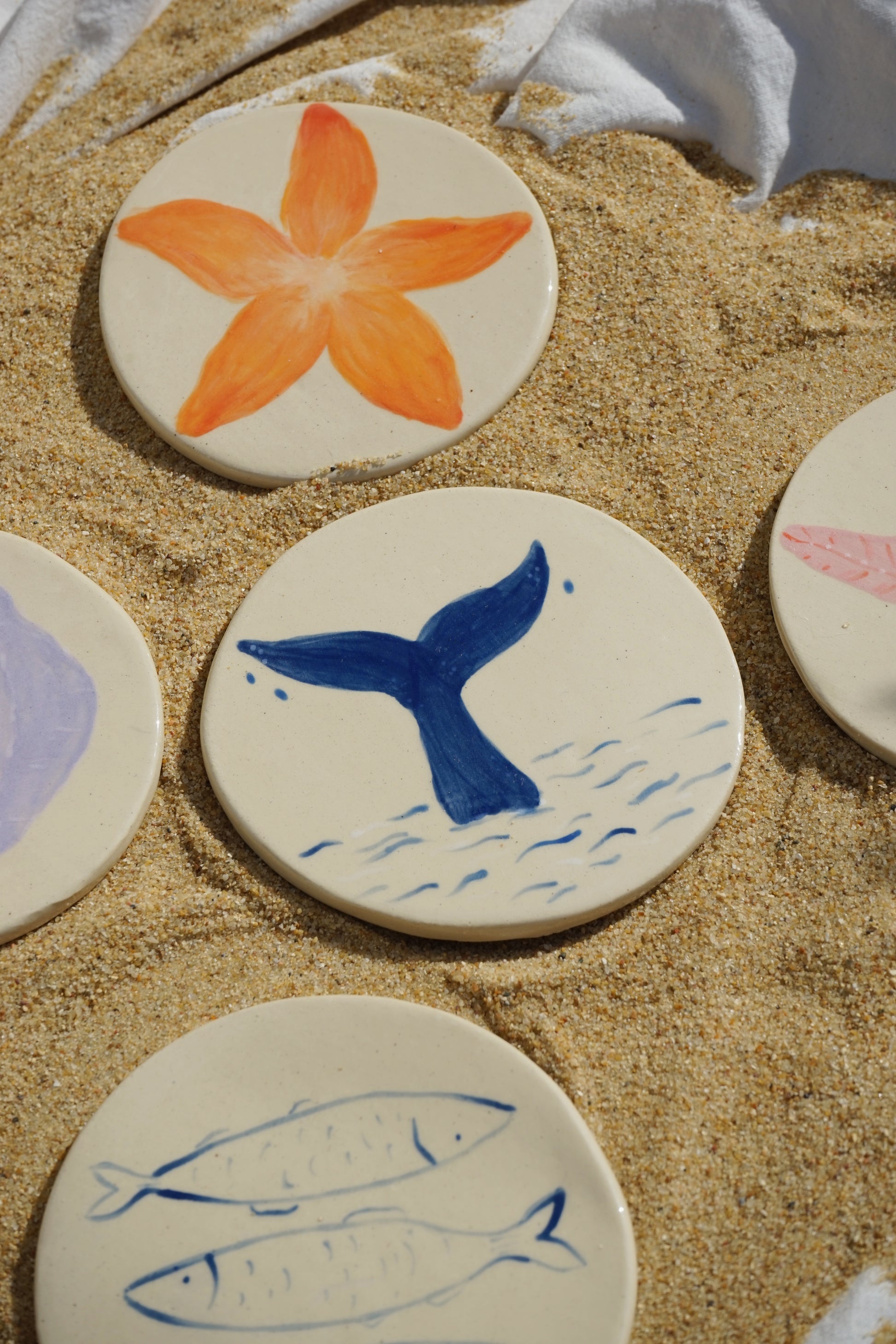 Set en grès blanc tournée et décorée à la main avecdes motifs terre et mer.