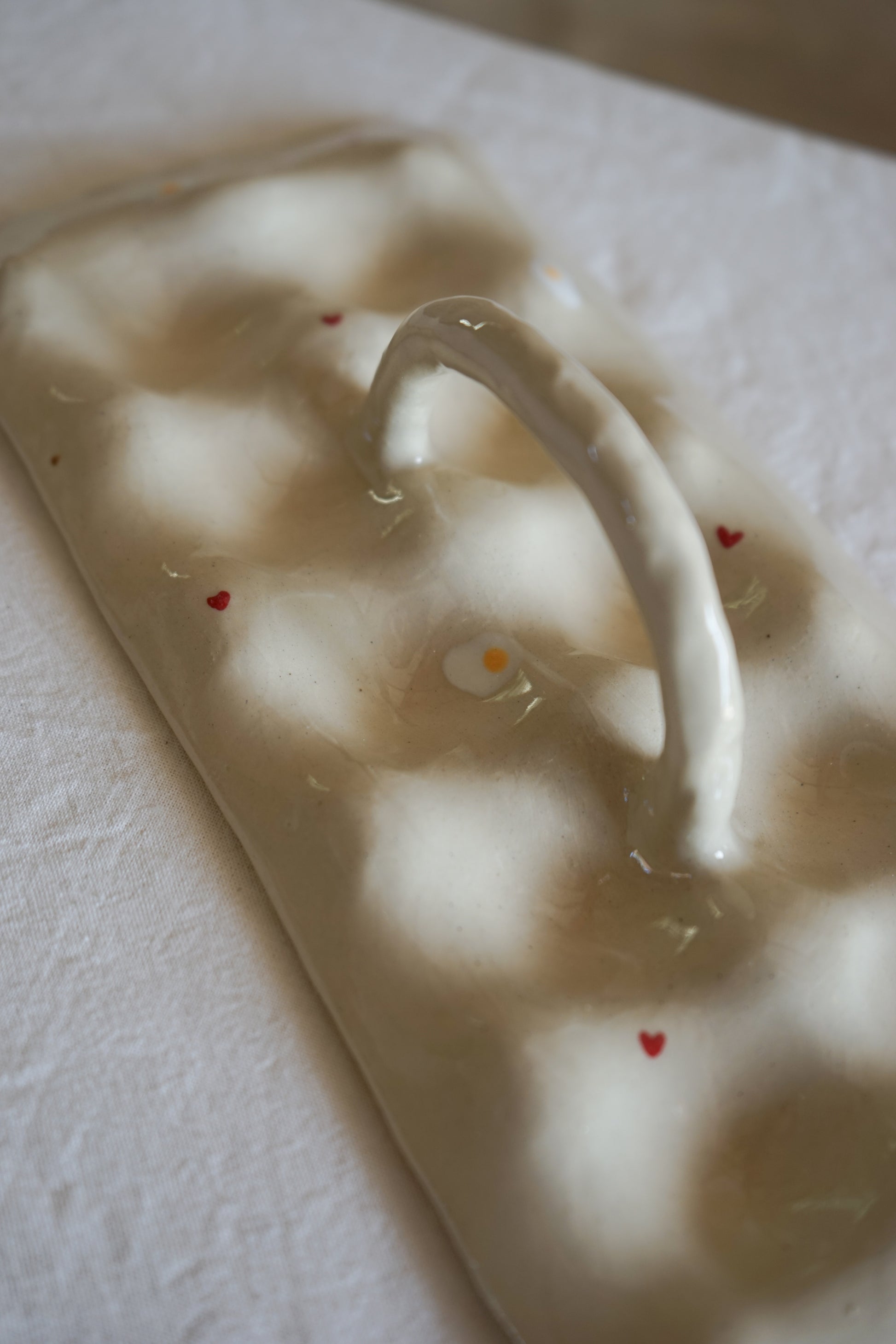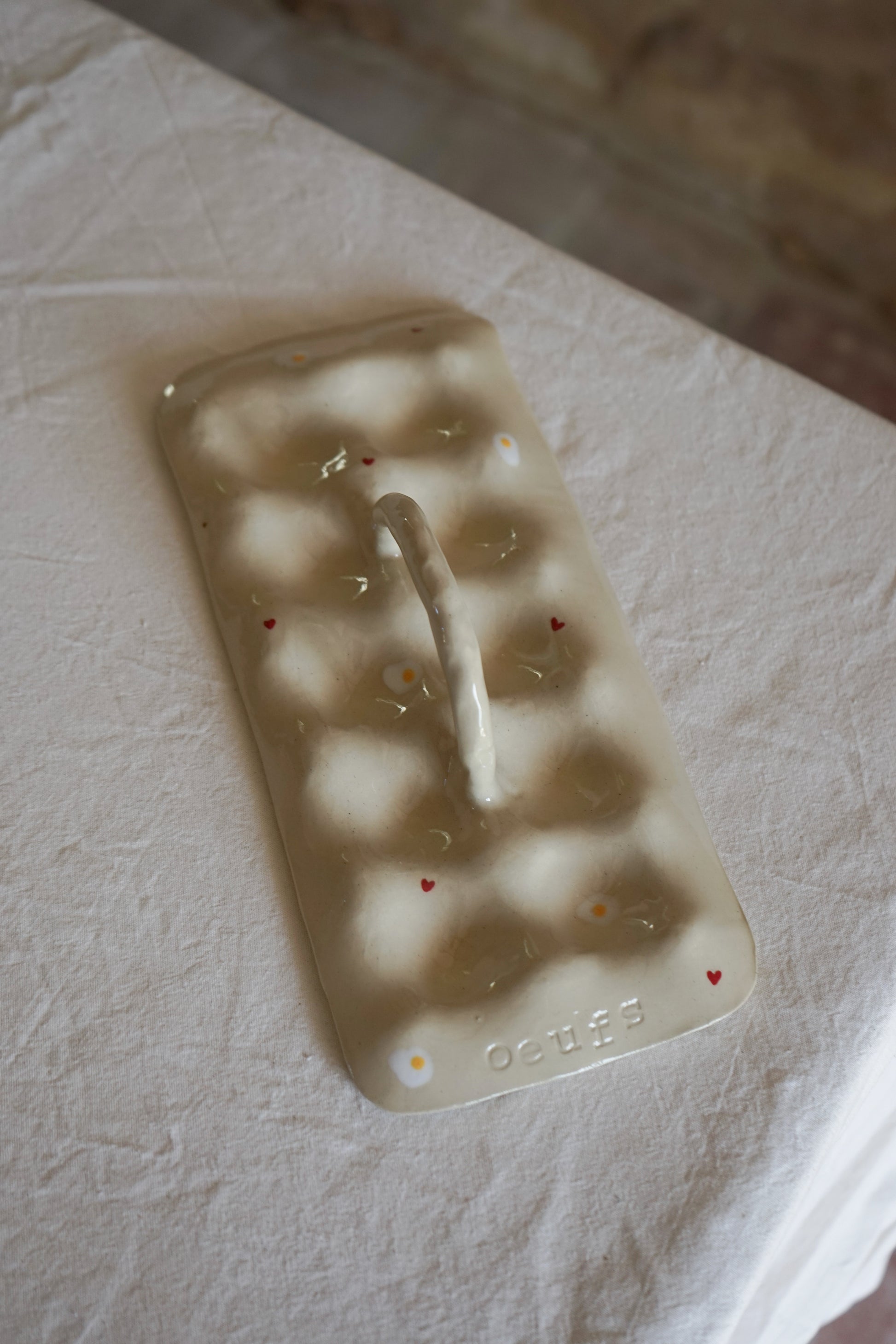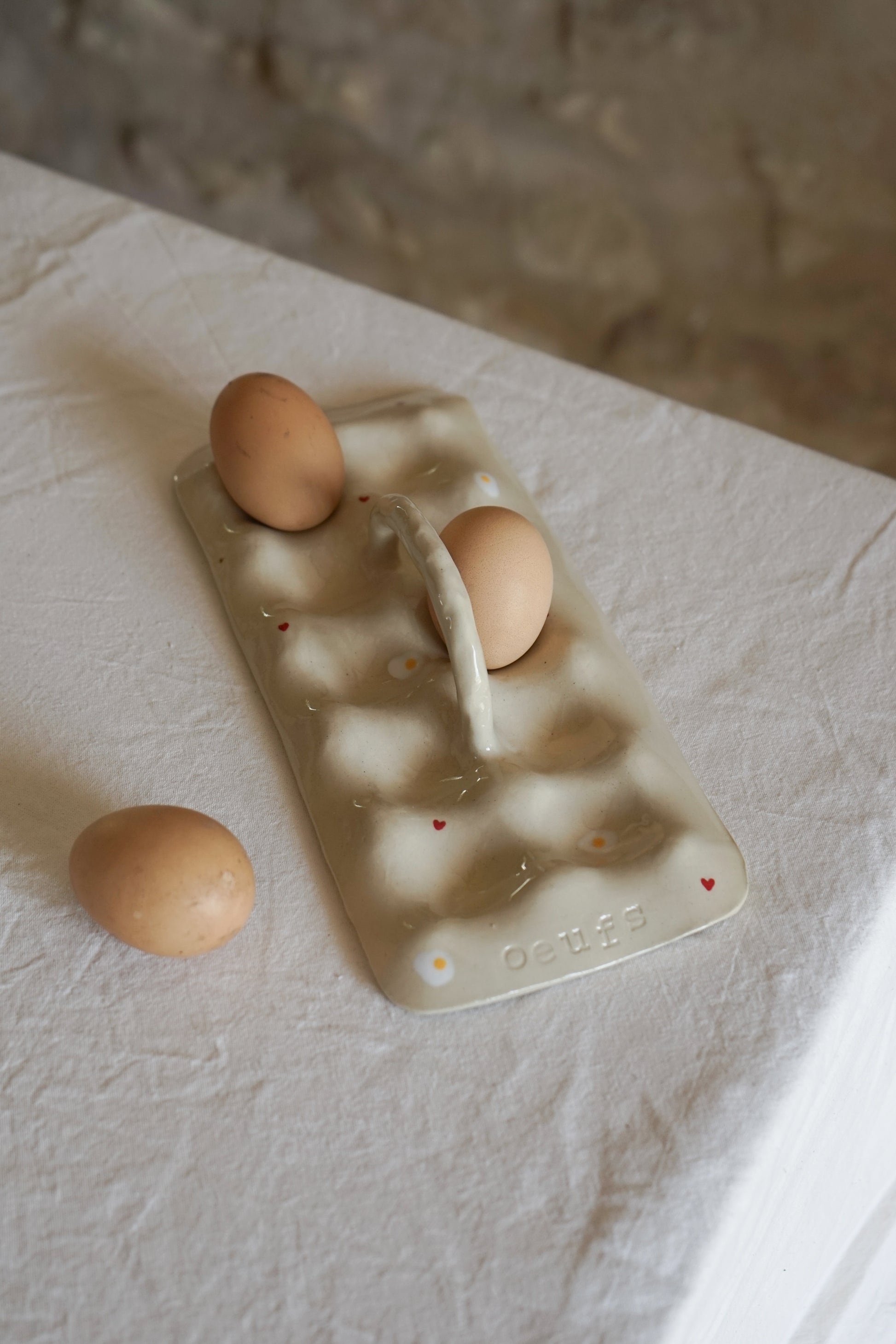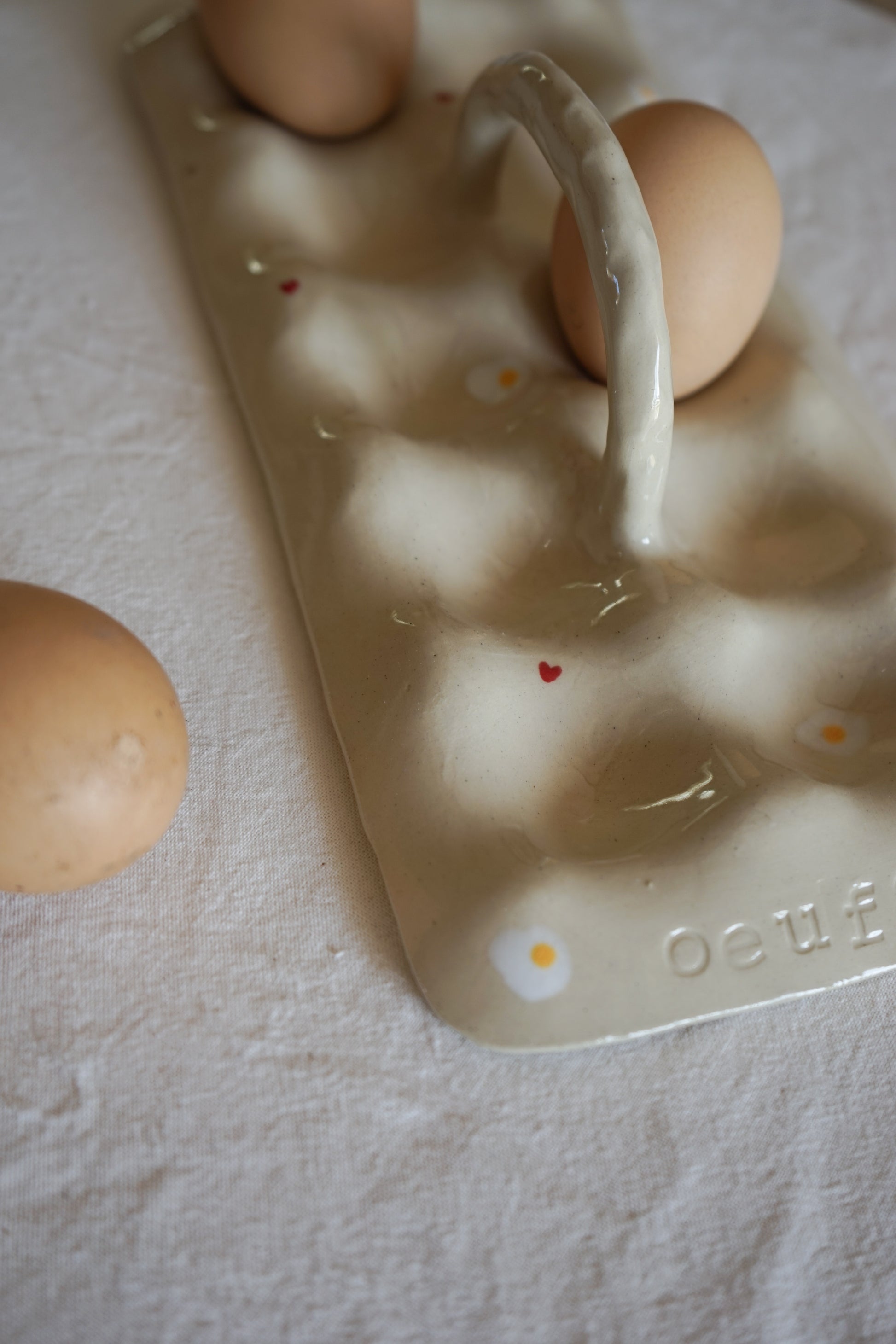 Support à œufs en grès blanc modelé et décoré à la main avec des motifs cœur rouge et fleur bleue. Pratique pour ranger ou présenter jusqu’à 10 œufs, tout en ajoutant une touche décorative et originale à votre cuisine. Chaque pièce est artisanale et unique.