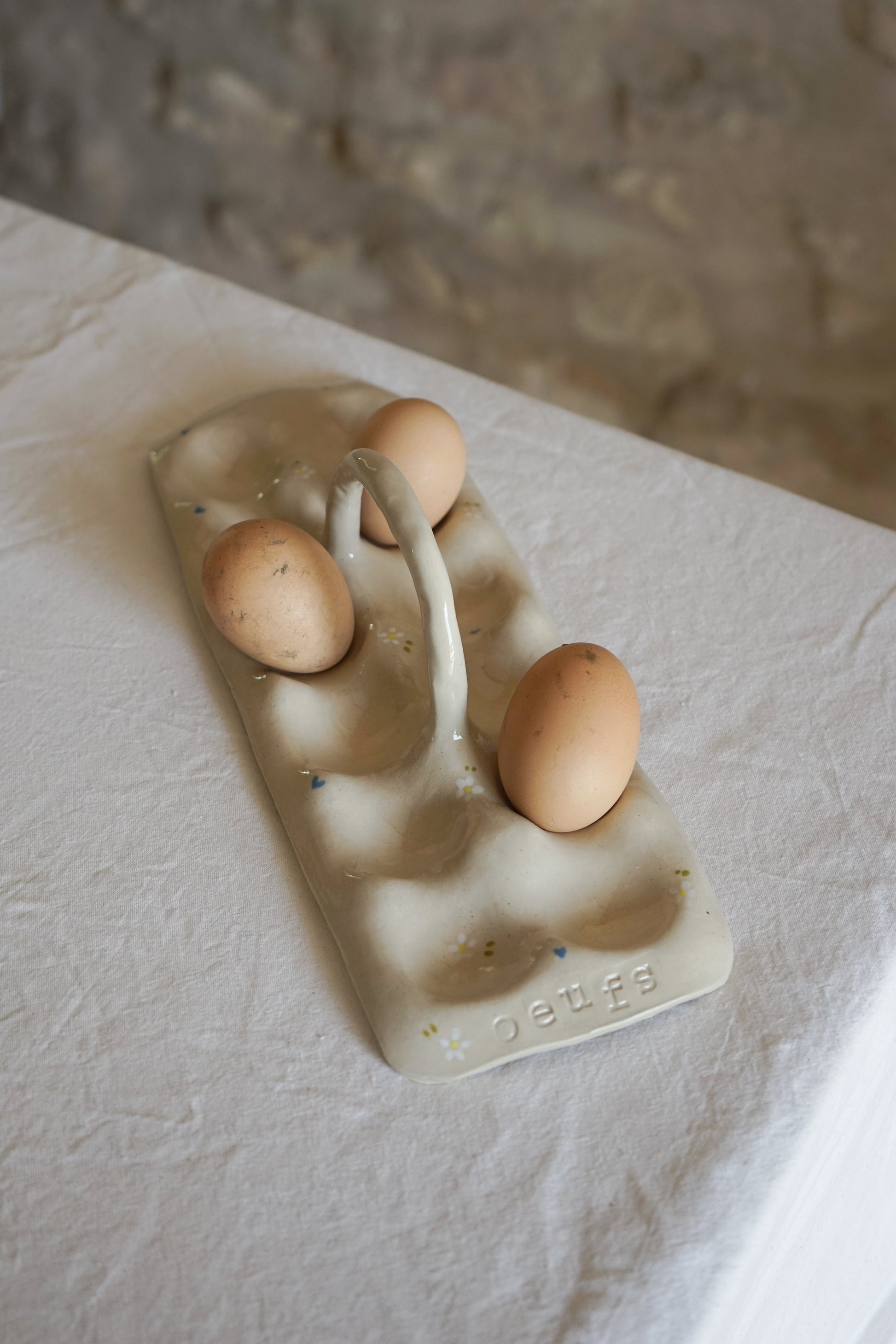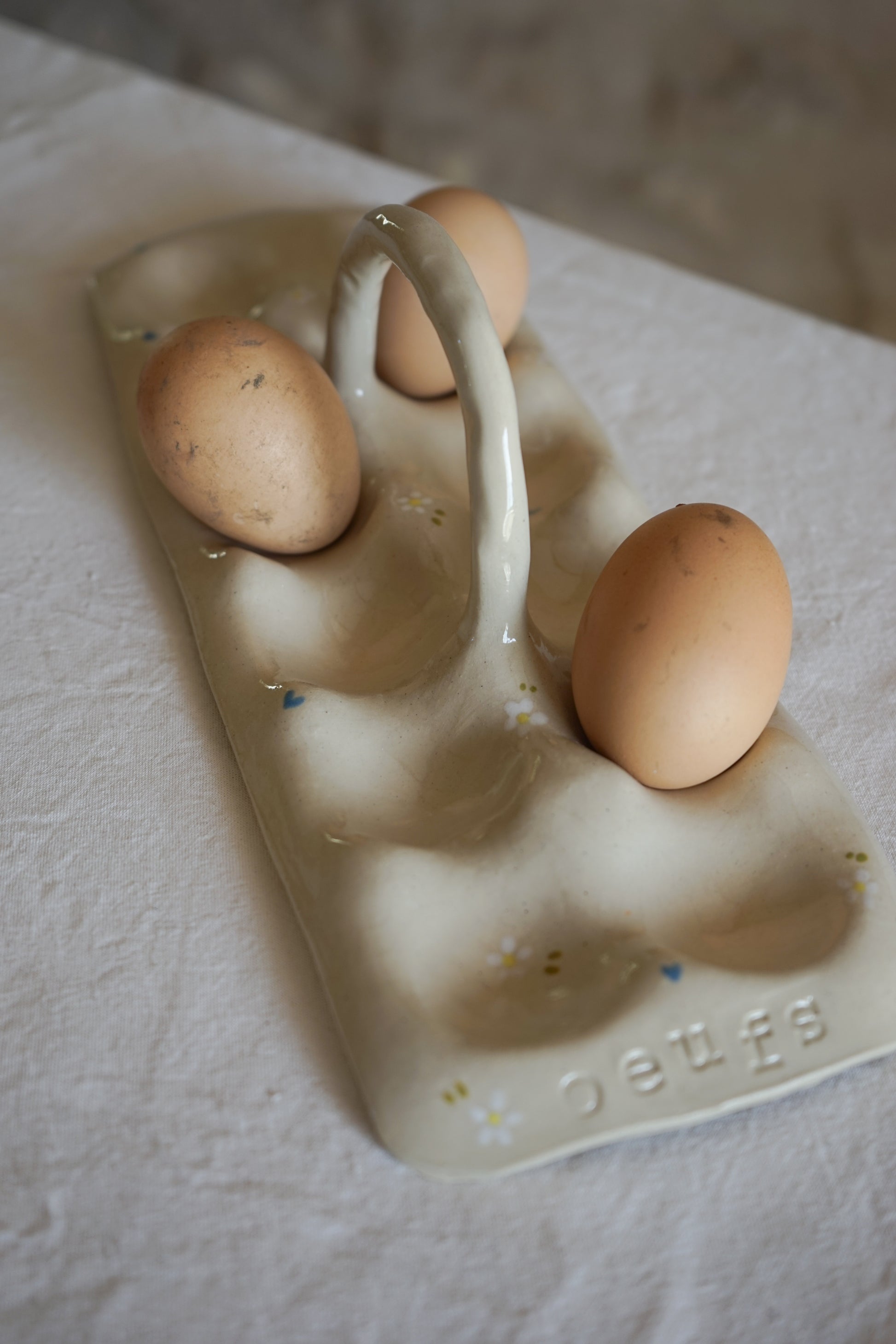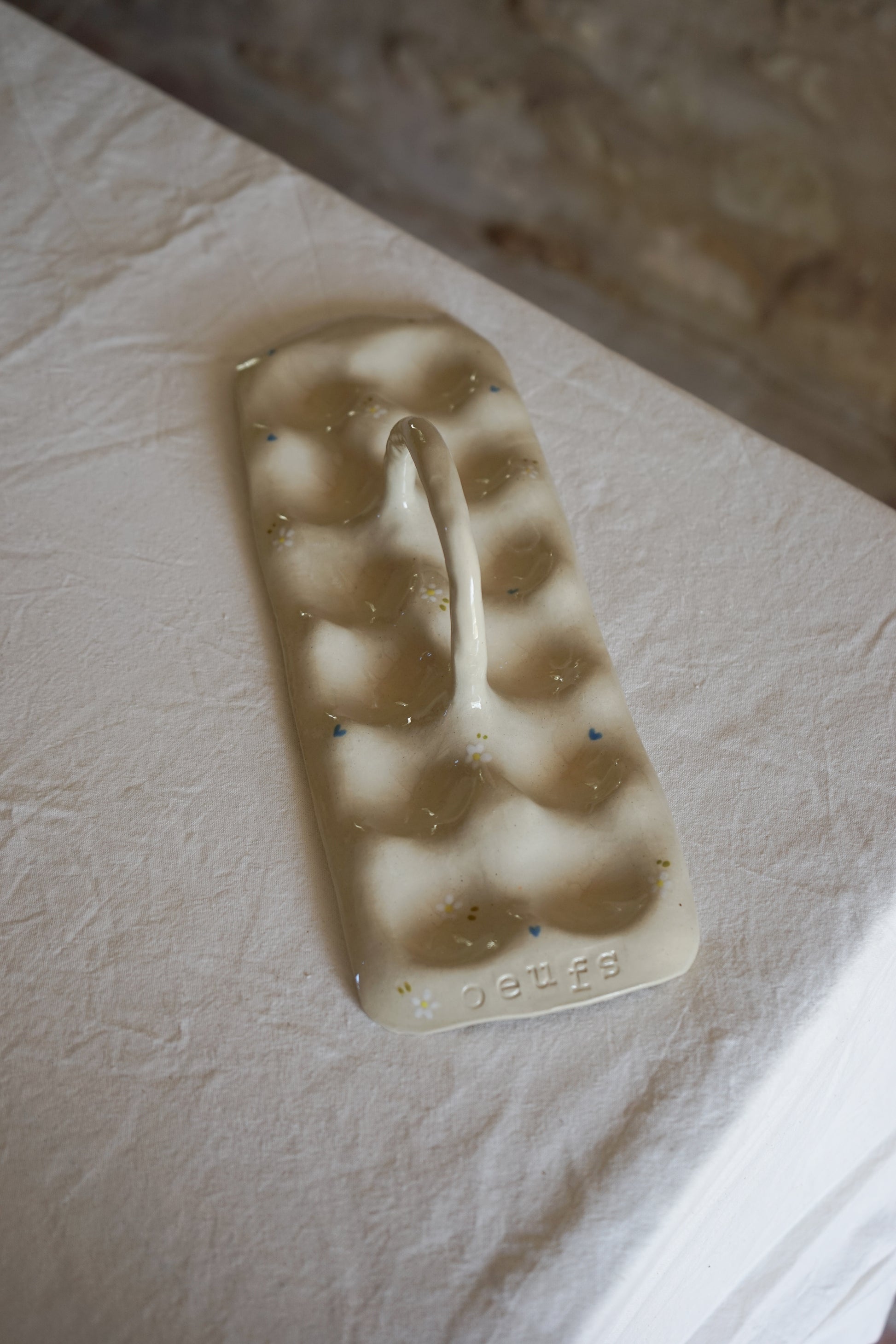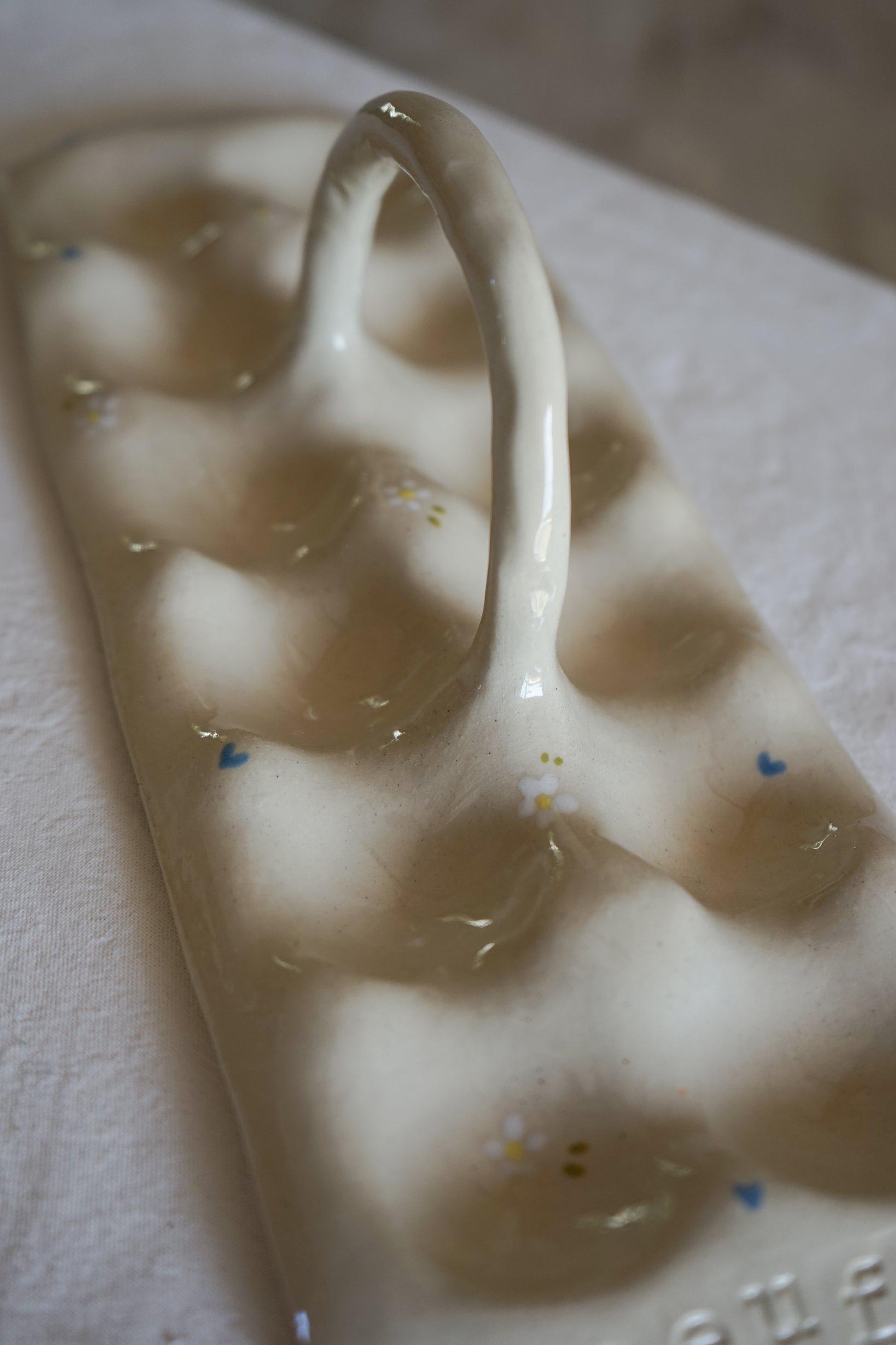 Support à œufs en grès blanc modelé et décoré à la main avec des motifs cœur rouge et fleur bleue. Pratique pour ranger ou présenter jusqu’à 12 œufs, tout en ajoutant une touche décorative et originale à votre cuisine. Chaque pièce est artisanale et unique.