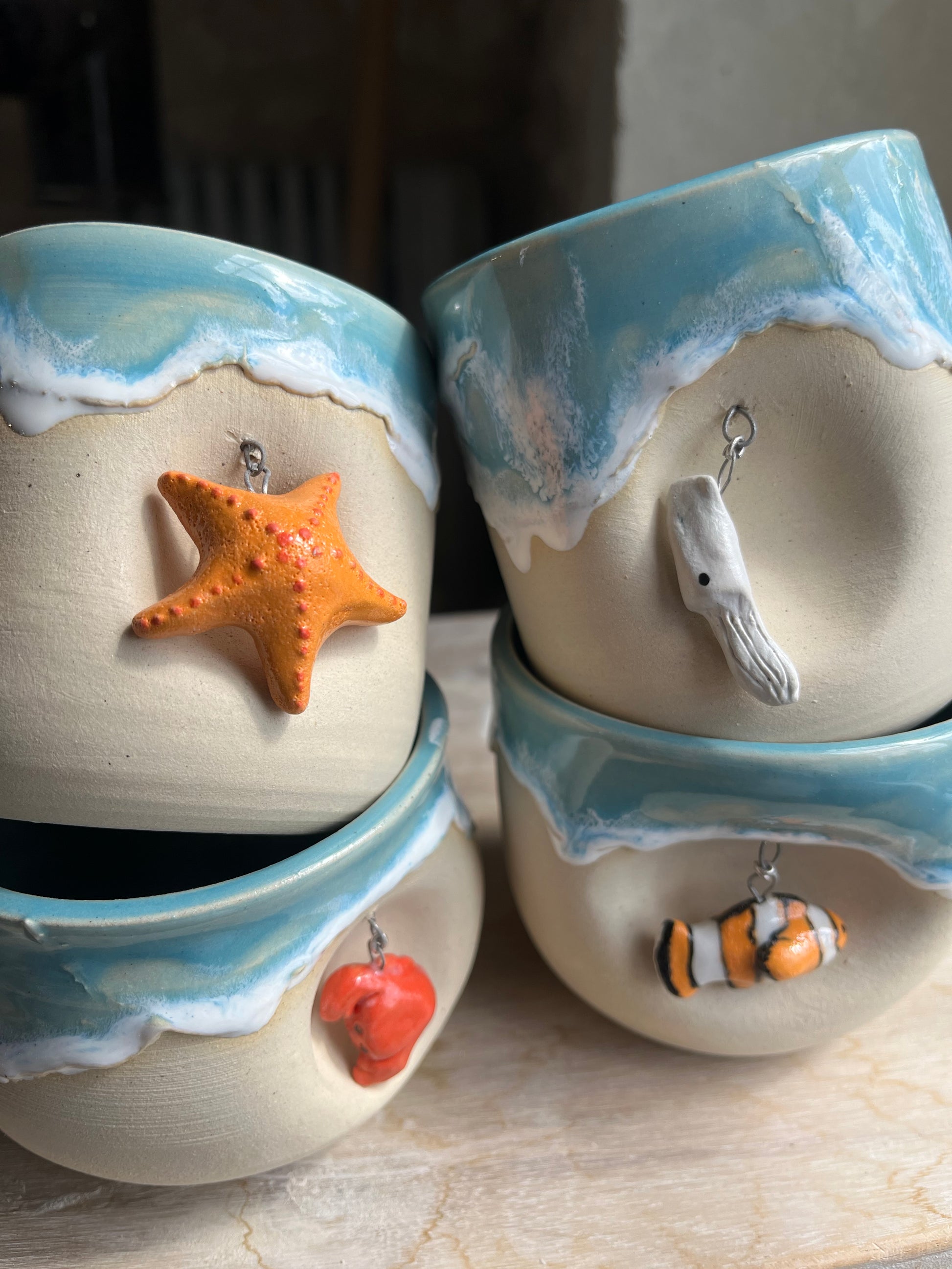 Chaque tasse est unique avec son animal marin modelé et assemblé à la main.