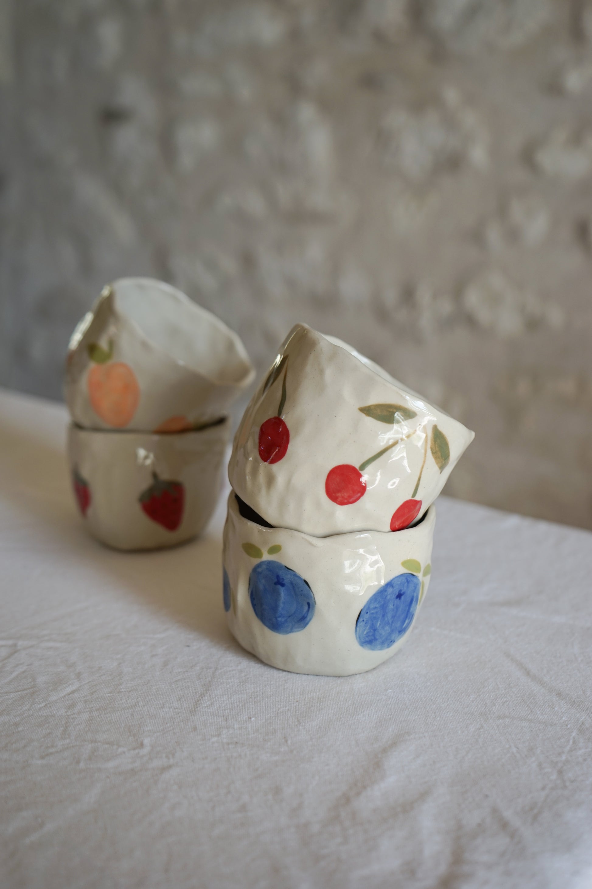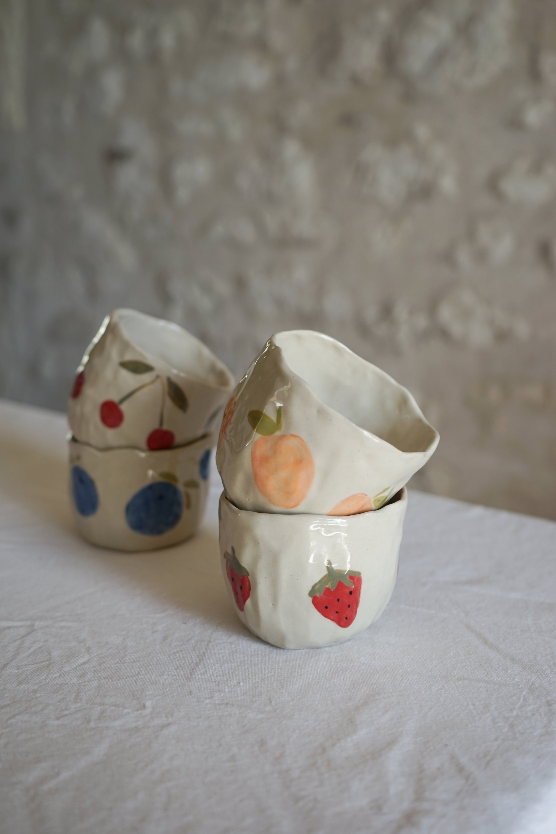 Tasse en grès blanc modelée entièrement à la main. Chaque tasse est décorée avec des fruits cerises, fraises, myrtilles, pêches, peints à la main.